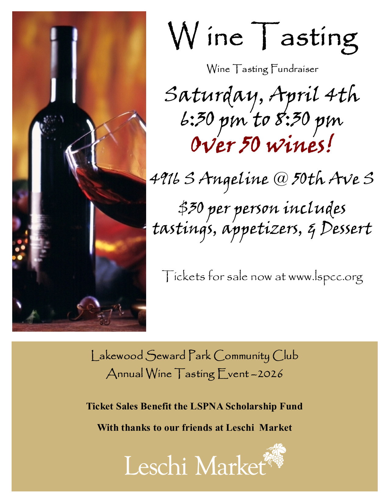 All proceeds from the Wine Tasting event support the Lakewood Seward Park Neighborhood Scholarship fund.